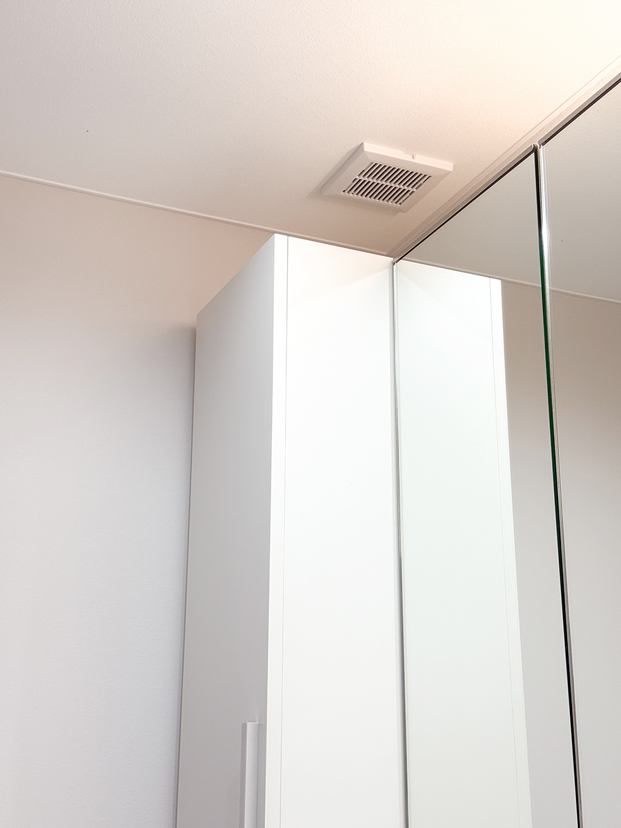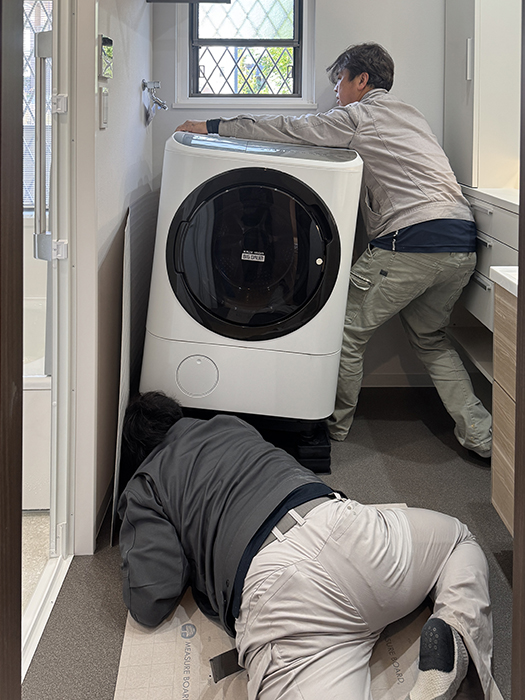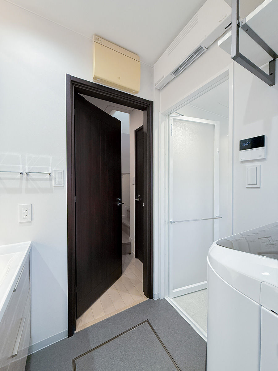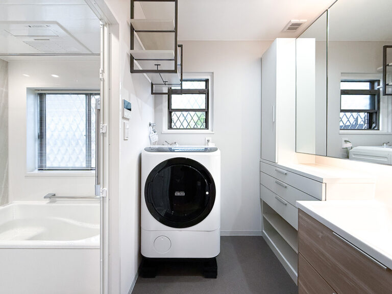 たとえば、洗面室のドアは当初は内開きの仕様。特に不便を感じていなかったのですが、このままだとドラム式洗濯機のドアと干渉して事故の原因にもなりかねない点をご指摘いただき、ドアを外開き仕様へ変更。安全性が担保されたことに加え、出入りもとても楽になったと実感しました。