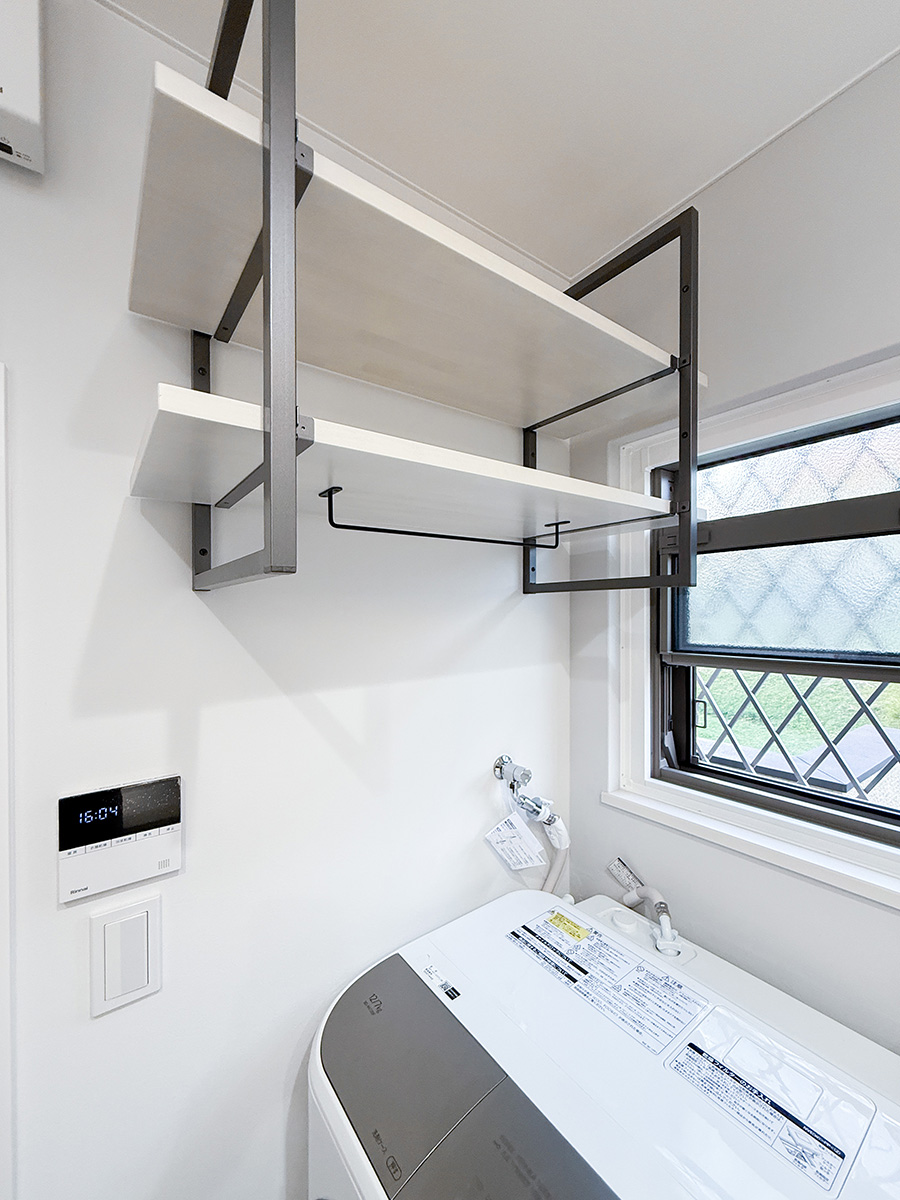 洗面化粧台:タカラスタンダード:ファミーユ 内窓:LIXILリプラス 洗濯機上棚:Panasonic:フレームシェルフ |