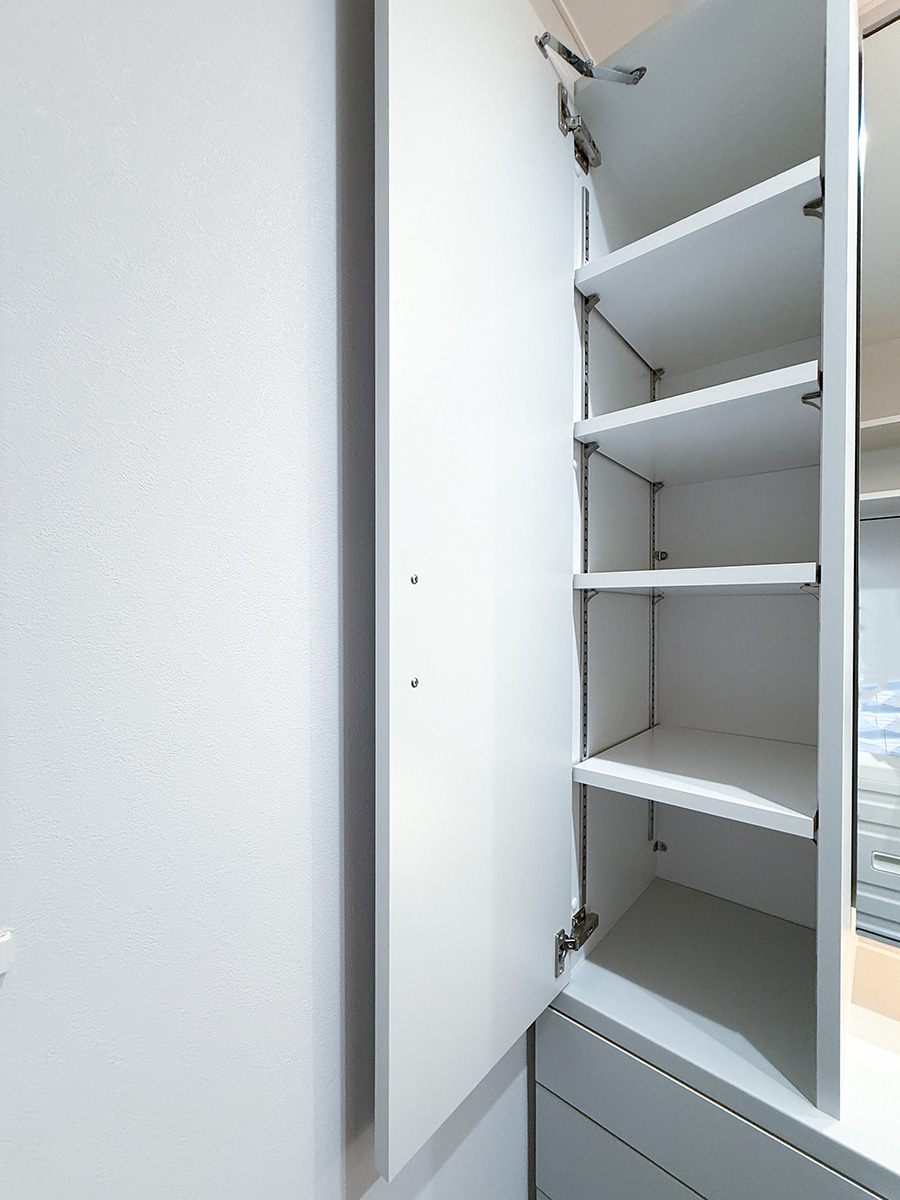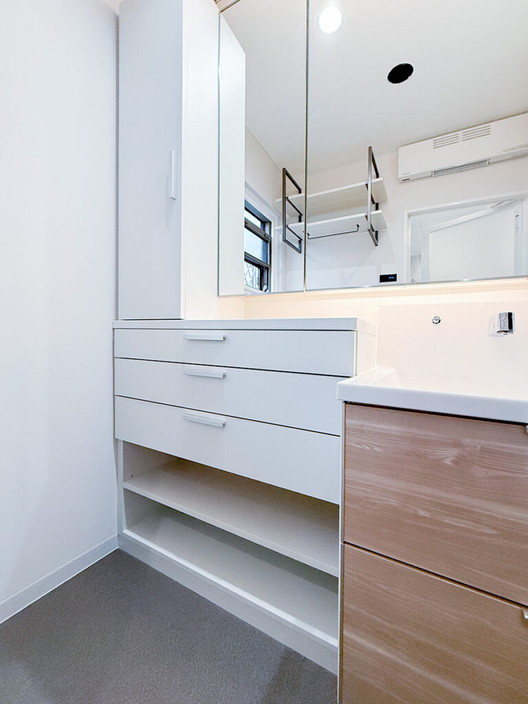 また、洗面室の収納力を高めたいと思い、既製品もいろいろと検討しましたが、なかなかサイズが合うものが見つからず…。造作で対応できると伺いお願いしたところ、ぴったりと収まるオリジナルの収納を作っていただくことができました。
